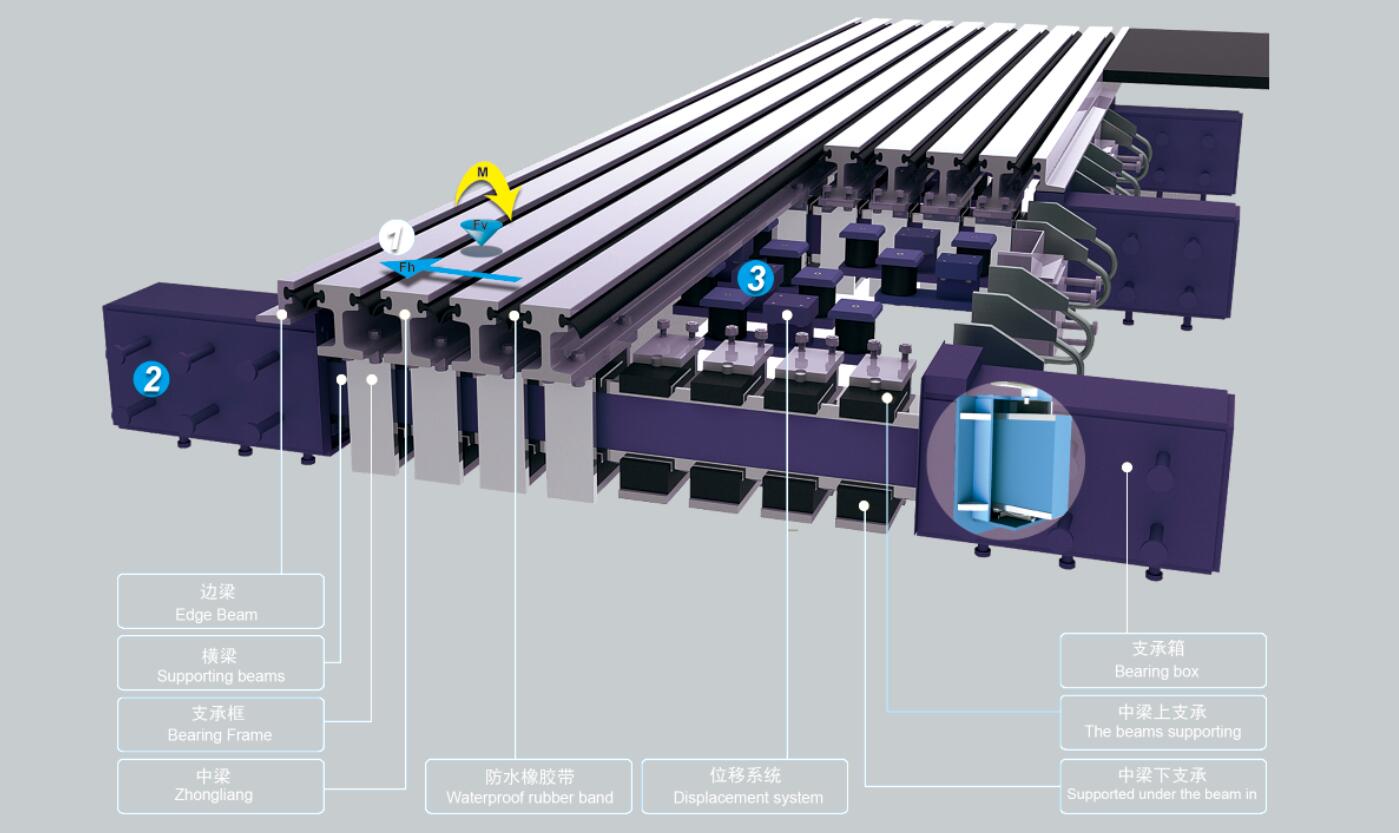 型鋼伸縮裝置是基于動力學抗疲勞原理而設(shè)計,采用了單支承橫梁的彈性支承系 統(tǒng)以及由串聯(lián)的剪切彈簧共同作用的位移控制系統(tǒng)。具有承載能力強、抗疲勞性能優(yōu)越、位移控制均勻等特點。